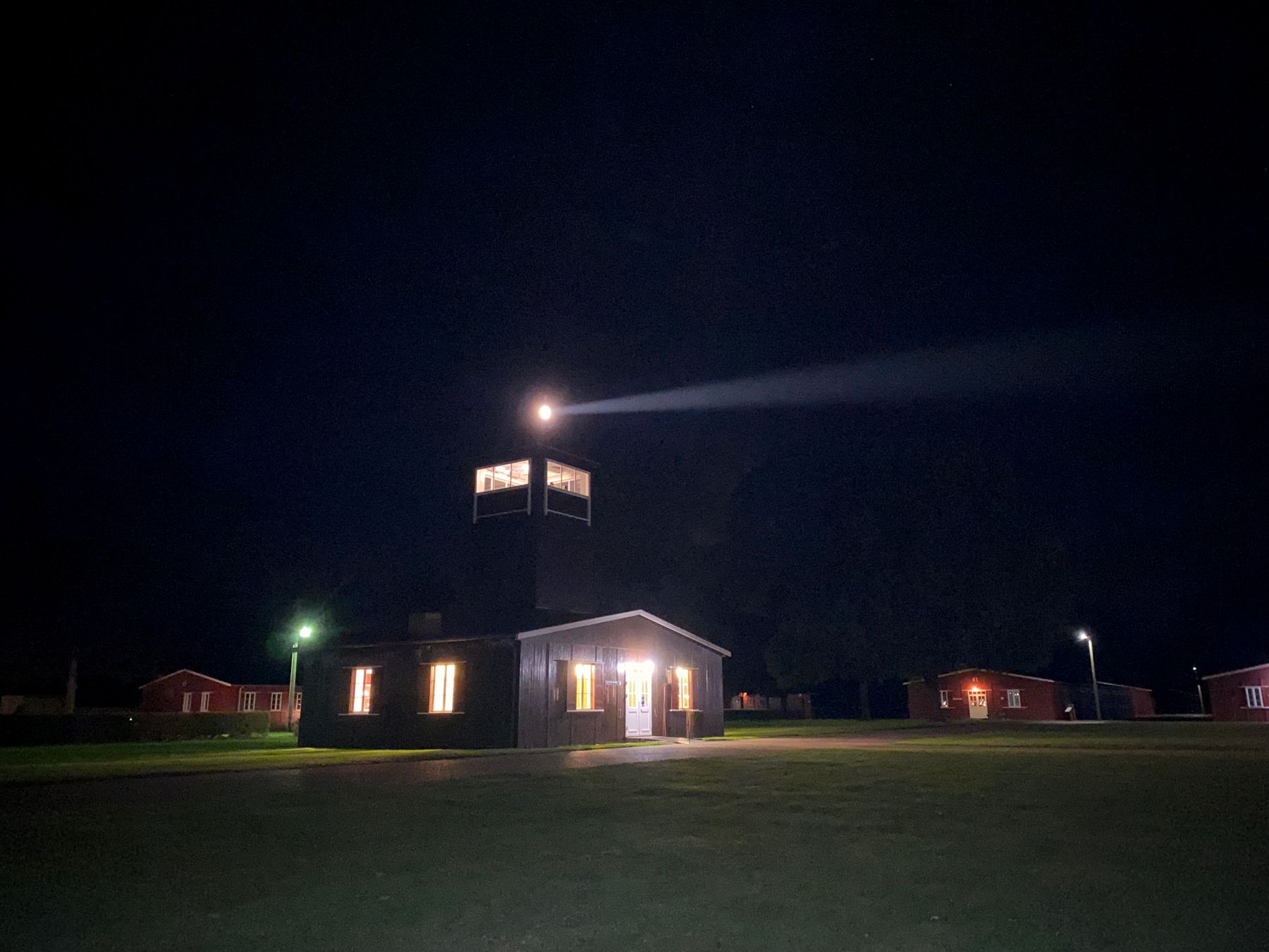 Projektørens lyskegle følger os gennem den mørke Frøslevlejr, mens guiden fortæller om fangernes desperate flugtforsøg ud mod minefeltet.